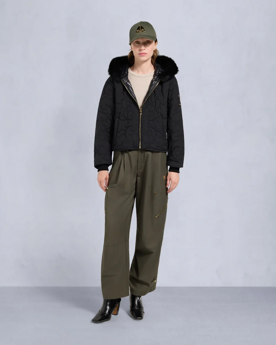 Entfernen Sie vor dem Waschen die abnehmbaren Verzierungen. Innenseite nach außen auf hoher Stufe chemisch reinigen. Maximale Bügeltemperatur 110 °C – ohne Dampf.